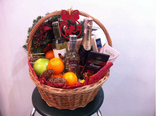 Масивні новорічні композиції збирають у великих кошиках і доповнюють їх нарівні зі святковими елементами цукерковими коробками, пляшками з алкоголем, наприклад, мартіні або шампанським. У такі букети також додають цікаву флористичну зелень, серед якої найбільше популярний гіперікум.